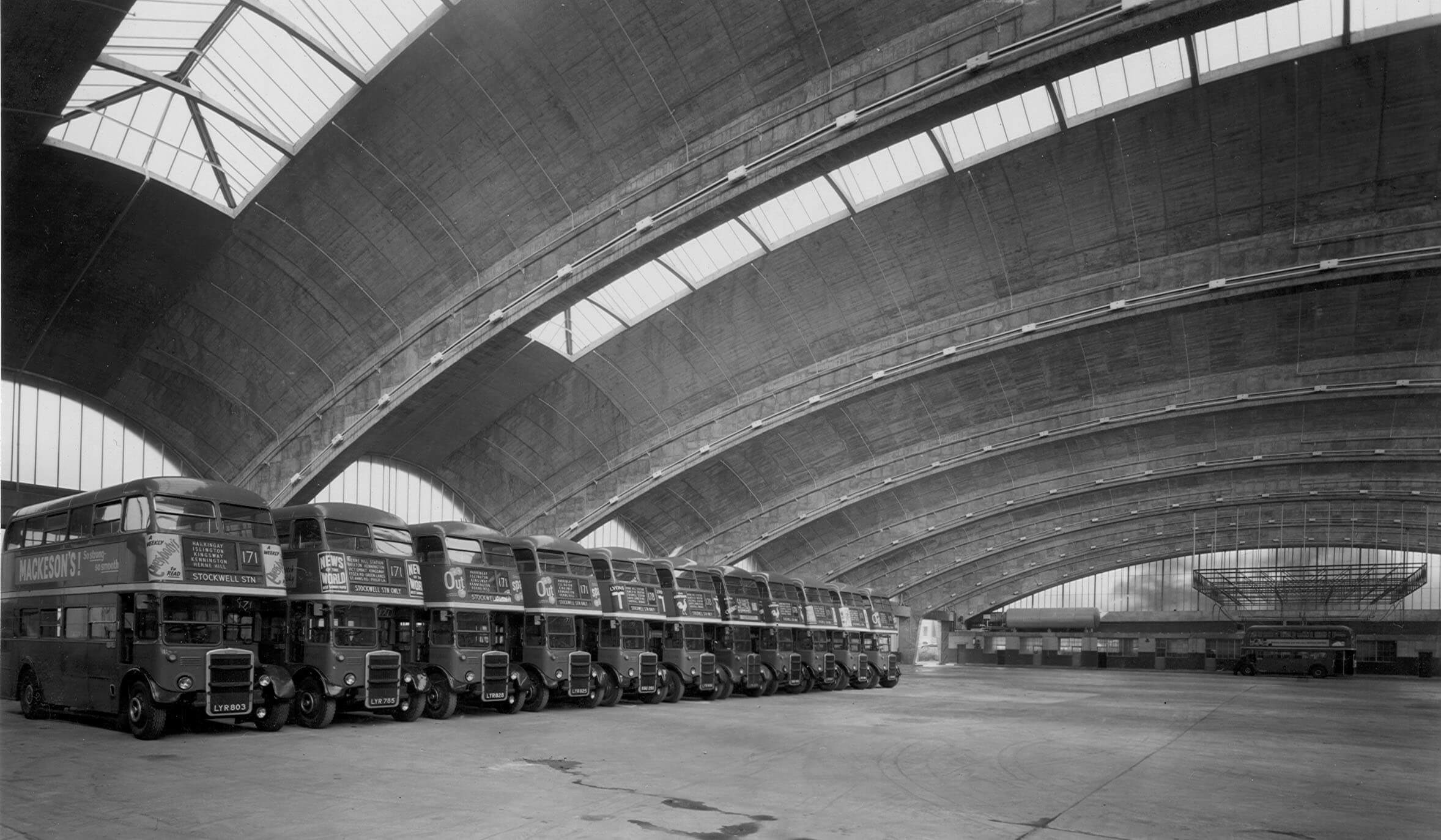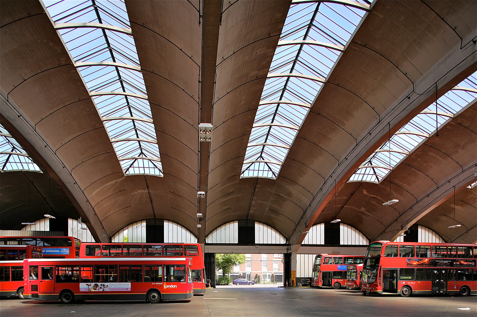 The outstanding feature of Stockwell Bus Garage is the use of reinforced concrete for the roof. At the time of construction, it was the largest column free area under one roof in Europe and provides 6,184 square metres of unobstructed parking space for 212 buses. The ‘gull-wing’ portal frame structure is supported by ten shallow ribs that span 120 metres; these are intersected by smaller ribs in order to prevent torsion. The vast space achieved is naturally lit by a sequence of large skylights. From the exterior, the main arches are visible as outward-leaning buttresses, with a segmental curve to each bay. They form a multi-arched roofline and appear as a continuous wave each topped by a rooflight. The Stockwell Bus Garage is now run by Go-Ahead London and employs over 750 staff running 11 daytime routes and 6 night-time routes all over London.
