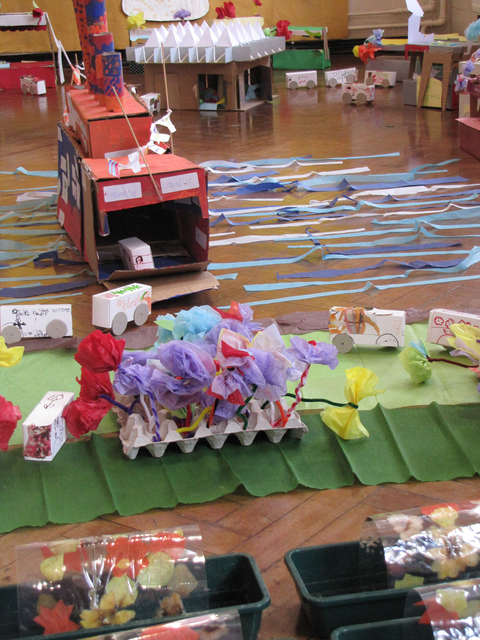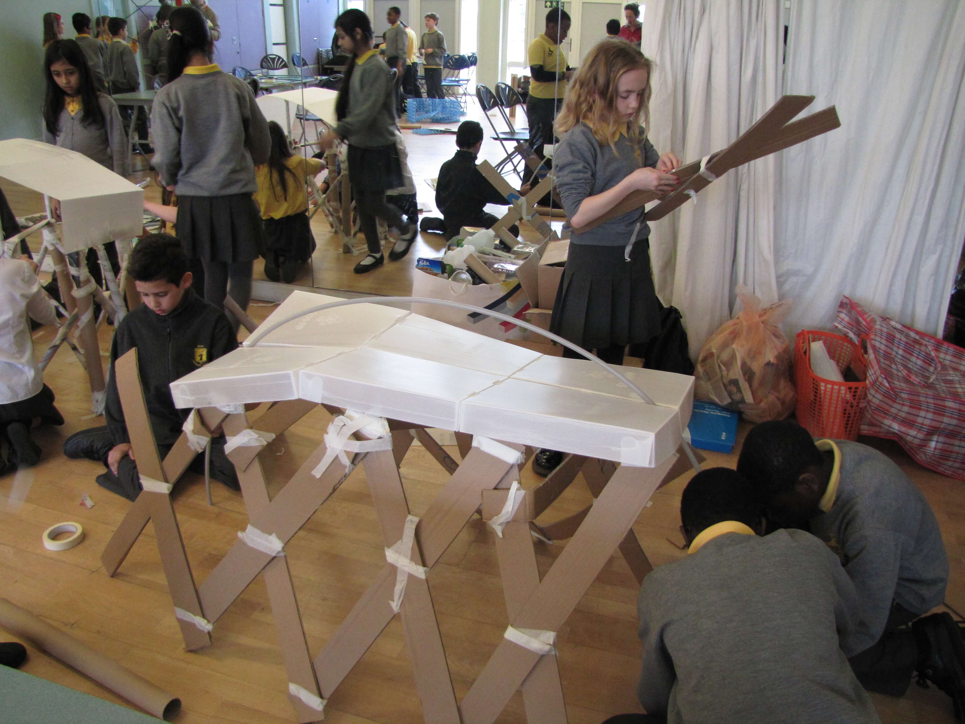 As part of A Space for Flowers project, the New Covent Garden Flower market was used as a catalyst for creative school workshops. Five schools were involved altogether, four carrying out architecture workshops with Our Hut and the fifth working with Click Photography Workshops recording the building photographically. The Our Hut projects started with introducing the children to architecture generally and then looking specifically at the flower market. Each class created 2D and 3D artwork either focusing on the ‘Journey of a Flower’ or as a response to an architectural brief for a hypothetical building.